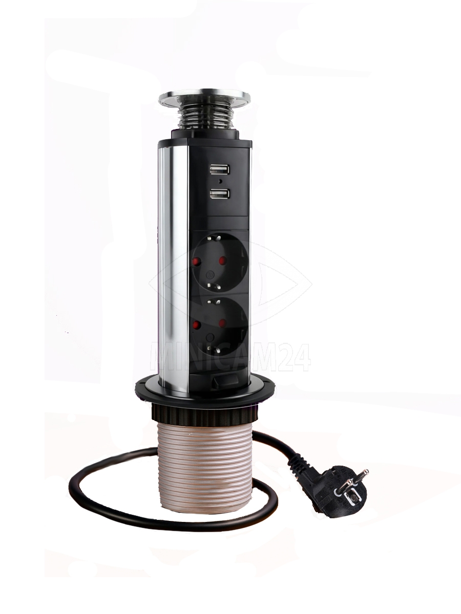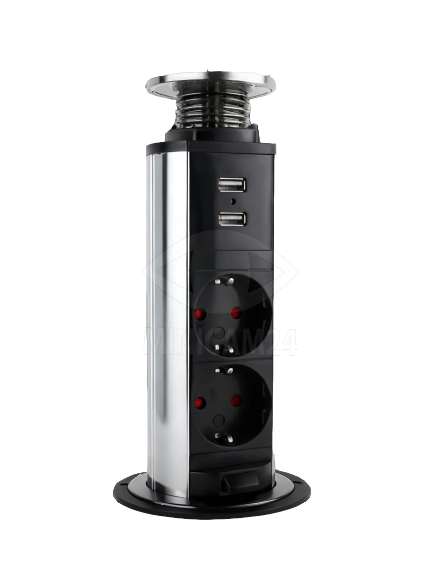 Приспособление для подключения потребителей электрического тока. Конструкция розетки позволяет обеспечить ее недоступность при отсутствии питаемых приборов, что повышает общий уровень безопасности. Дополнительно розетка снабжена 2 USB входами, которые позволяют подключить Data-кабель для зарядки и различные гаджеты. Производится из прочных, диэлектрических полимерных материалов. Длина кабеля с вилкой составляет 1,8 метров.
